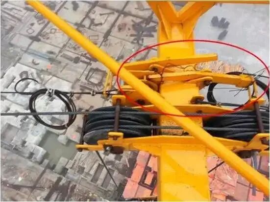 塔吊用卸料平臺(tái)反拉鋼絲繩內(nèi)外兩根系在一根預(yù)埋環(huán)上且埋環(huán)留置太長(zhǎng),鋼絲繩與混凝土接觸點(diǎn)未設(shè)隔離墊。
