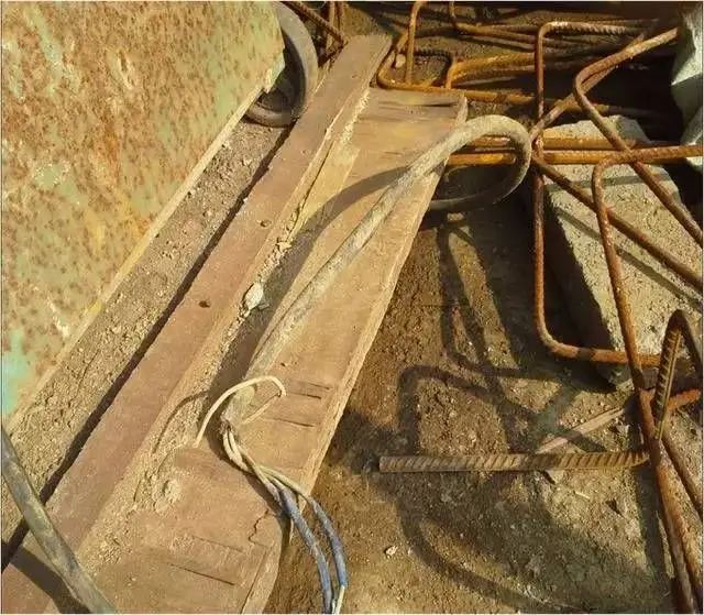 塔吊用卸料平臺(tái)反拉鋼絲繩內(nèi)外兩根系在一根預(yù)埋環(huán)上且埋環(huán)留置太長(zhǎng),鋼絲繩與混凝土接觸點(diǎn)未設(shè)隔離墊